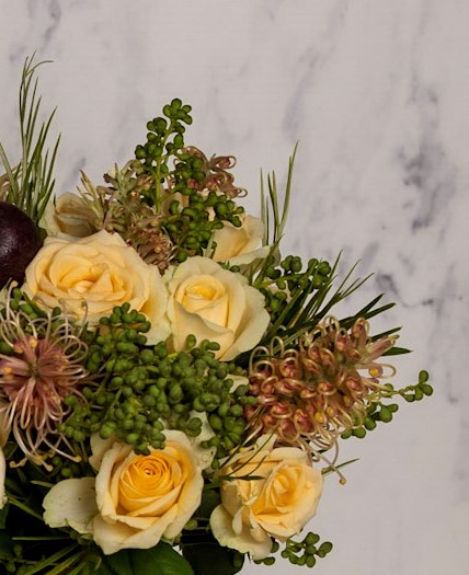 מגש עץ מלבני, עם שפע פרחים בצבעי אפרסק, בורגונדי וירוק,משולב רימוני נוי,חגיגי ומלא הדר, נותר רק להניח על שולחן החג.